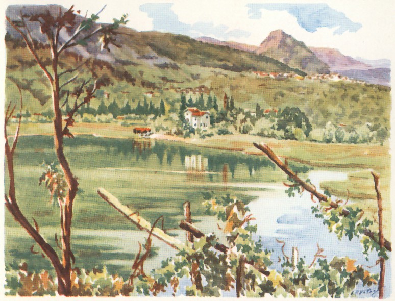Ischia (Trento) — Il Monte Cimirlo visto dal lago acquerello Collezione privata